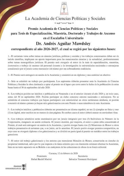 Bases Premio Academia de Ciencias Políticas y Sociales para Tesis de Especialización, Maestría, Doctorado y Trabajos de Ascenso en el Escalafón Universitario «Dr. Andrés Aguilar Mawdsley» 2026-2027 Inicio » Premios Bases Premio Academia de Ciencias Políticas y Sociales para Tesis de Especialización, Maestría, Doctorado y Trabajos de Ascenso en el Escalafón Universitario «Dr. Andrés Aguilar Mawdsley» 2026-2027 Descargue el documento [et_social_share]