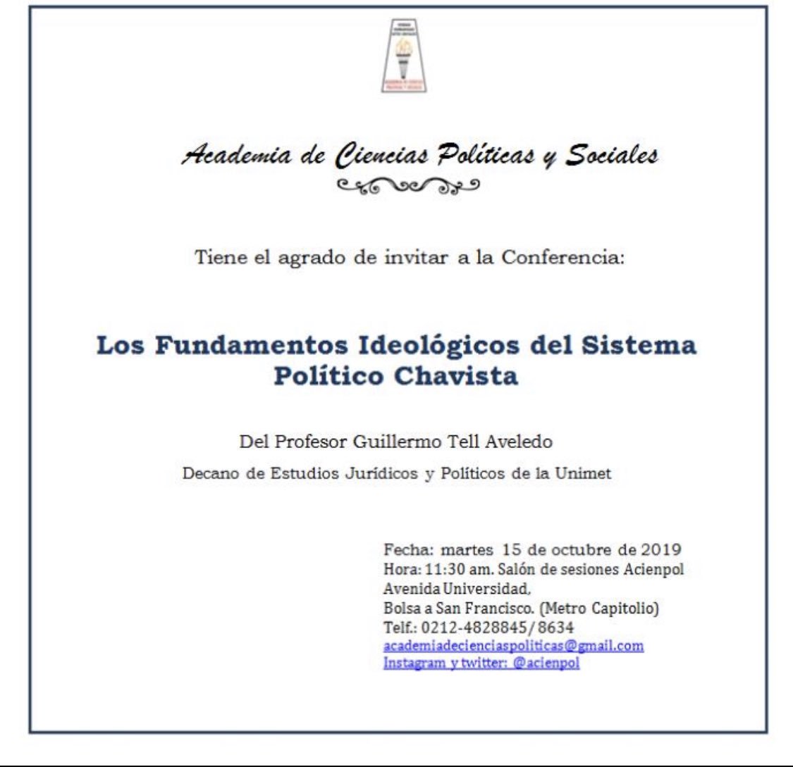 El 15 de octubre de 2019 se realizó la conferencia «Los fundamentos ideológicos del sistema político chavista», a cargo del profesor Guillermo Tell Aveledo