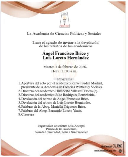 Develación de los retratos de los académicos Ángel Francisco Brice y Luis Loreto Hernández. Martes 3 de febrero de 2026. Hora: 11:00 a.m. Inicio » Eventos Develación de los retratos de los académicos Ángel Francisco Brice y Luis Loreto Hernández Martes 3 de febrero de 2026 Hora: 11:00 a.m. Descargue el documento [et_social_share]