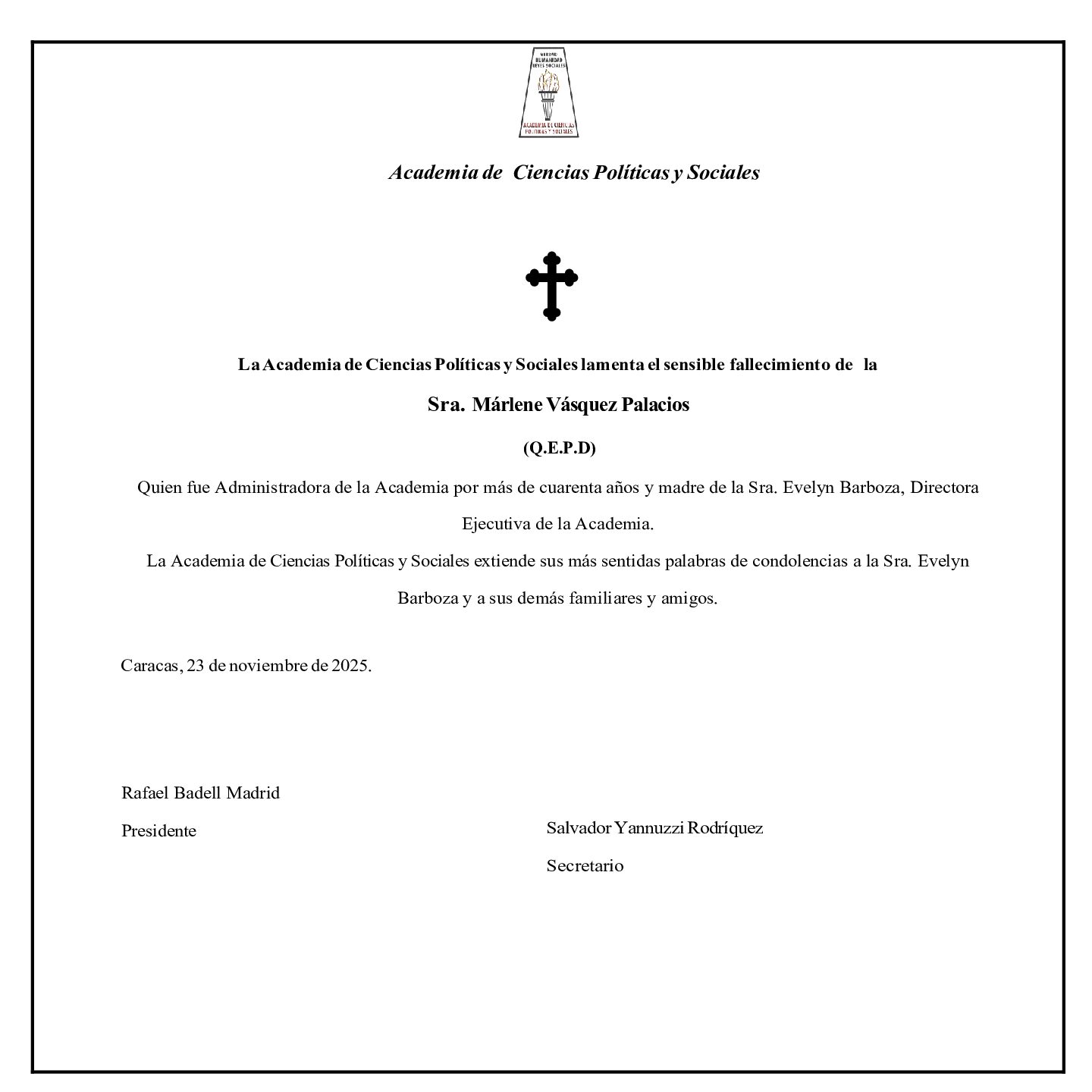 La Academia de Ciencias Políticas y Sociales lamenta el sensible fallecimiento de la Sra. MARLENE VÁSQUEZ PALACIOS. Madre de la Sra. Evelyn Barboza, Directora Ejecutiva de la Academia Inicio » Noticias La Academia de Ciencias Políticas y Sociales lamenta el sensible fallecimiento de la Sra. MARLENE VÁSQUEZ PALACIOS (Q.E.P.D) Madre de la Sra. Evelyn Barboza, Directora Ejecutiva de la Academia Descargue el documento [et_social_share]