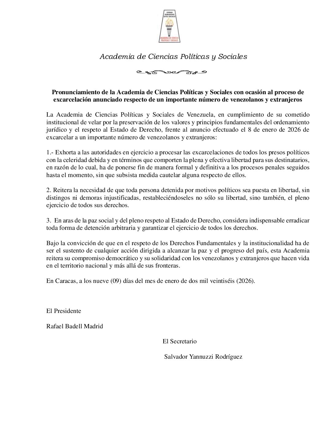 La Academia de Ciencias Políticas y Sociales de Venezuela, en cumplimiento de su cometido institucional de velar por la preservación de los valores y principios fundamentales del ordenamiento jurídico y el respeto al Estado de Derecho, frente al anuncio efectuado el 8 de enero de 2026 de excarcelar a un importante número de venezolanos y extranjeros