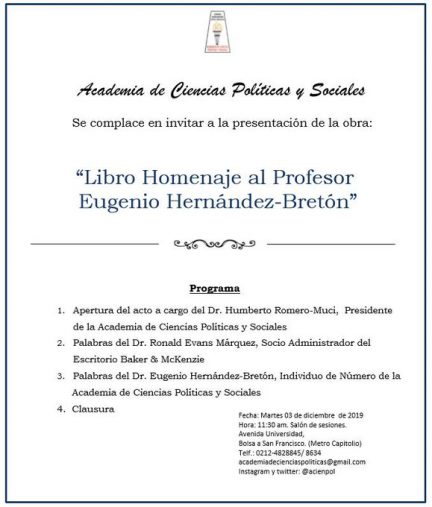 El 03 de diciembre de 2019 se realizó la presentación de la obra: «Libro Homenaje al Profesor Eugenio Hernández-Bretón»
