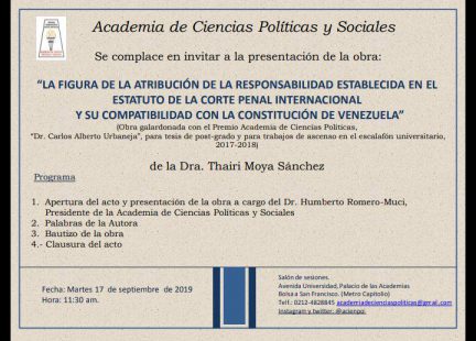 La Academia de Ciencias Políticas y Sociales se complace en invitar a la presentación de la obra: «La figura de la atribución de la responsabilidad establecida en el estatuto de la Corte Penal Internacional y su compatibilidad con la Constitución de Venezuela”. Autora Dra. Thairi Moya Sánchez